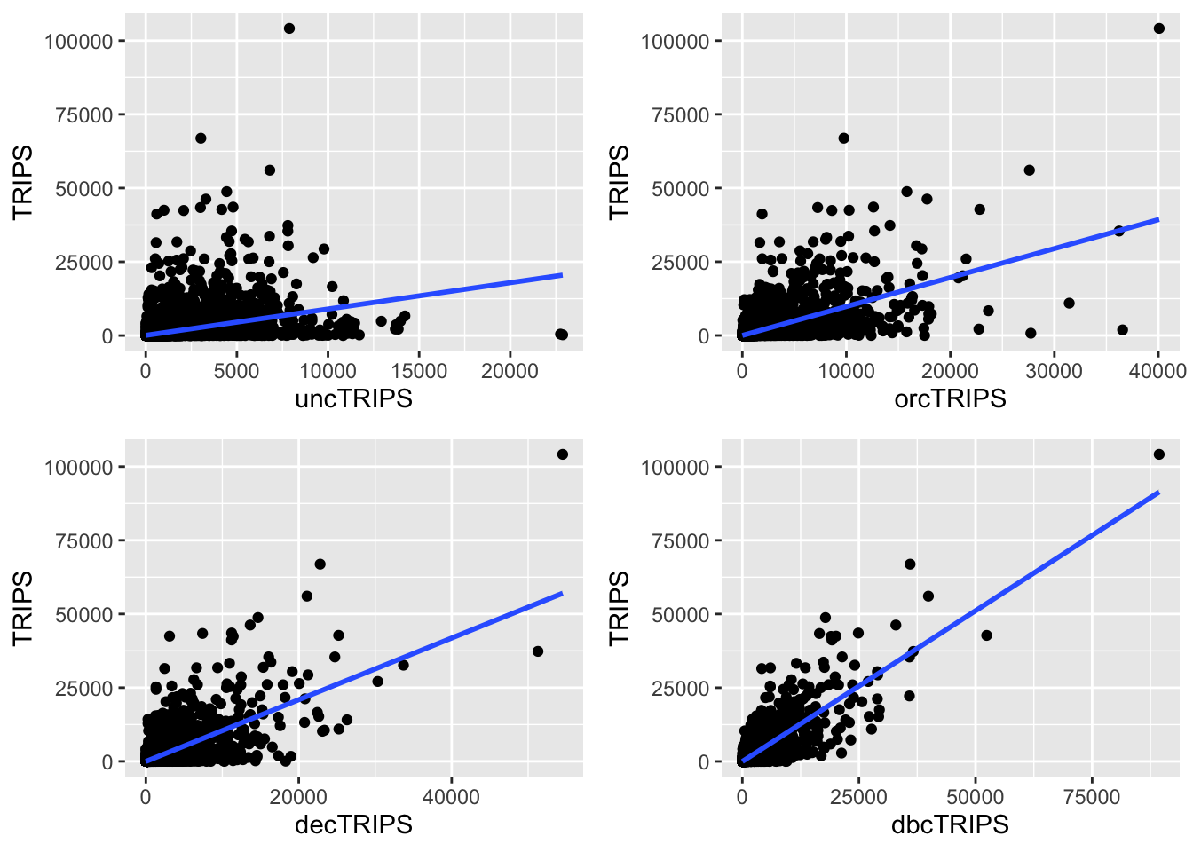 rename(uncTRIPS = "uncSIM$fitted.values")Repeat for Origin Constrained SIM (i.e. orcSIM)